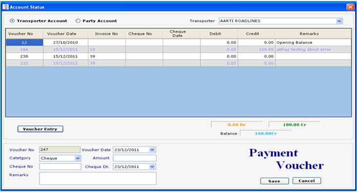 This form is help to see the Debit/Credit balance about the party. On the same form make the voucher Entry against the party. When click on the Voucher Entry Button then open payment voucher at bellow the same form.